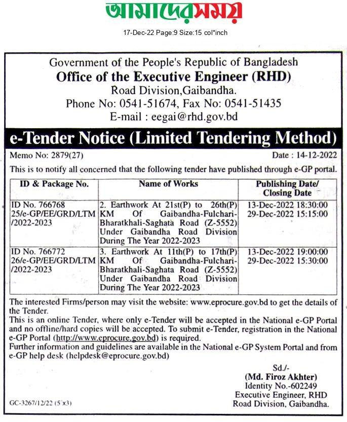 | Tender organization | Gaibandha LGED |
