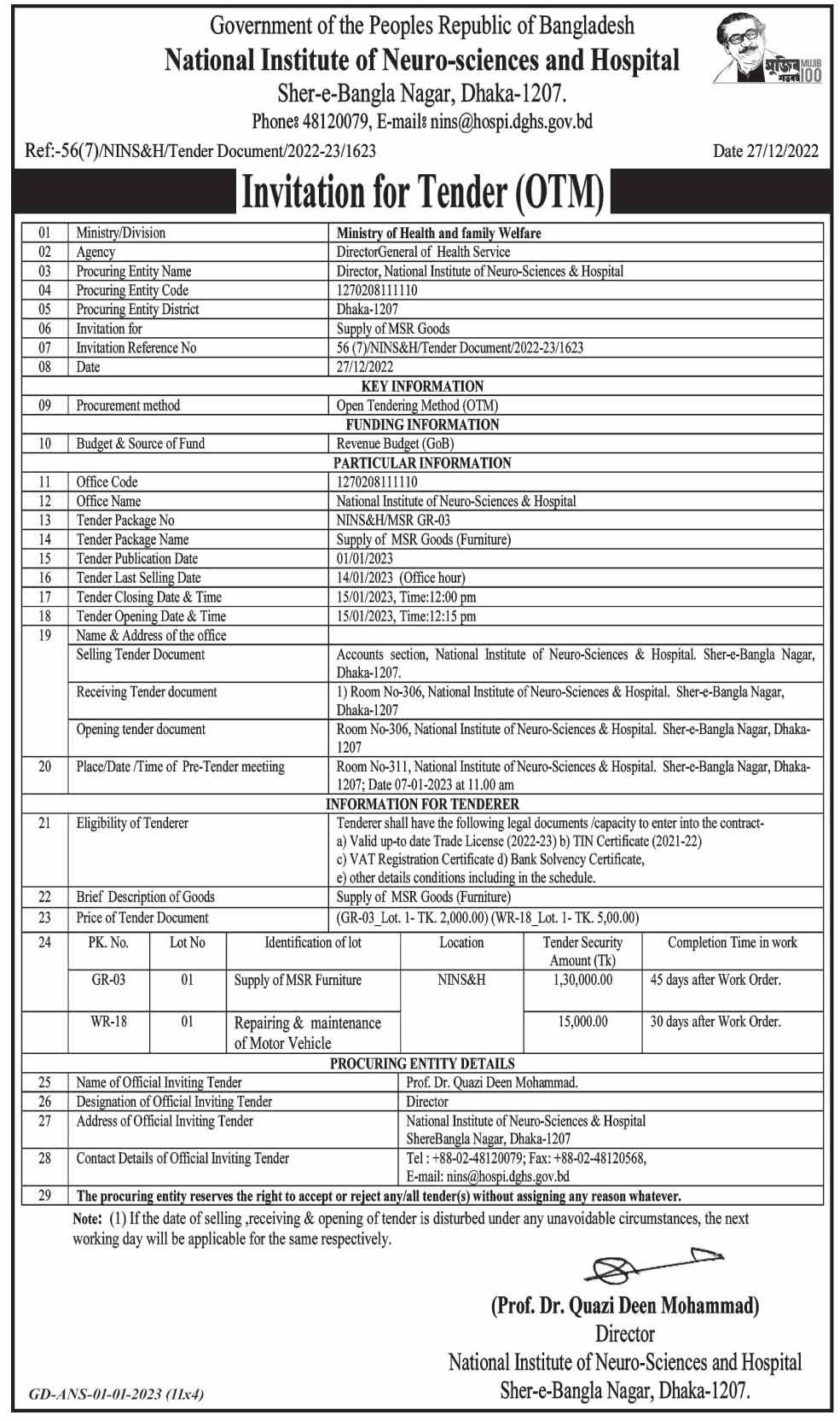 | Tender organization | National Institute of Neuro-sciences and Hospital |