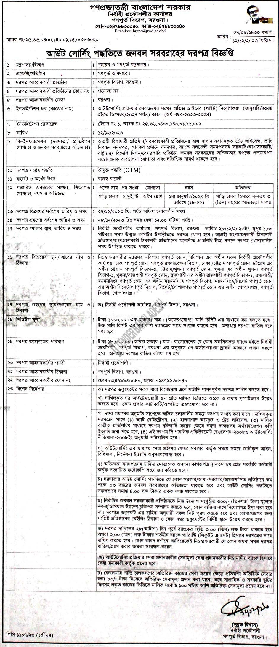 | Tender organization | Barguna PWD |