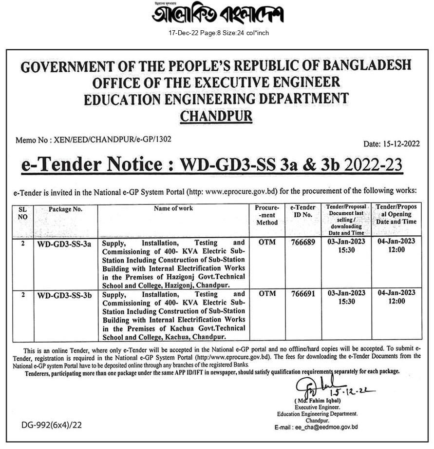 | Tender organization | Education Engineering Department |
