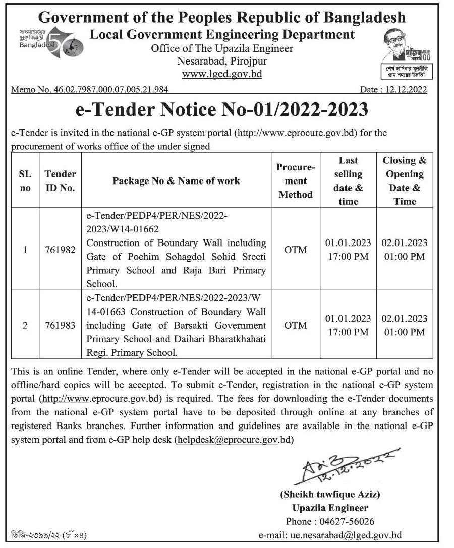 | Tender organization | Pirojpur LGED |